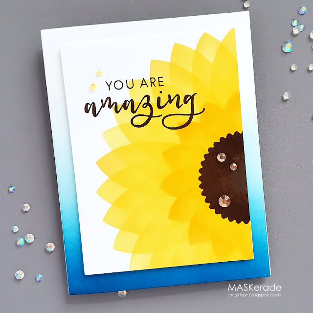I used a circle mask and a stencil to create my blue background element, using two shades of blue to add subtle interest.